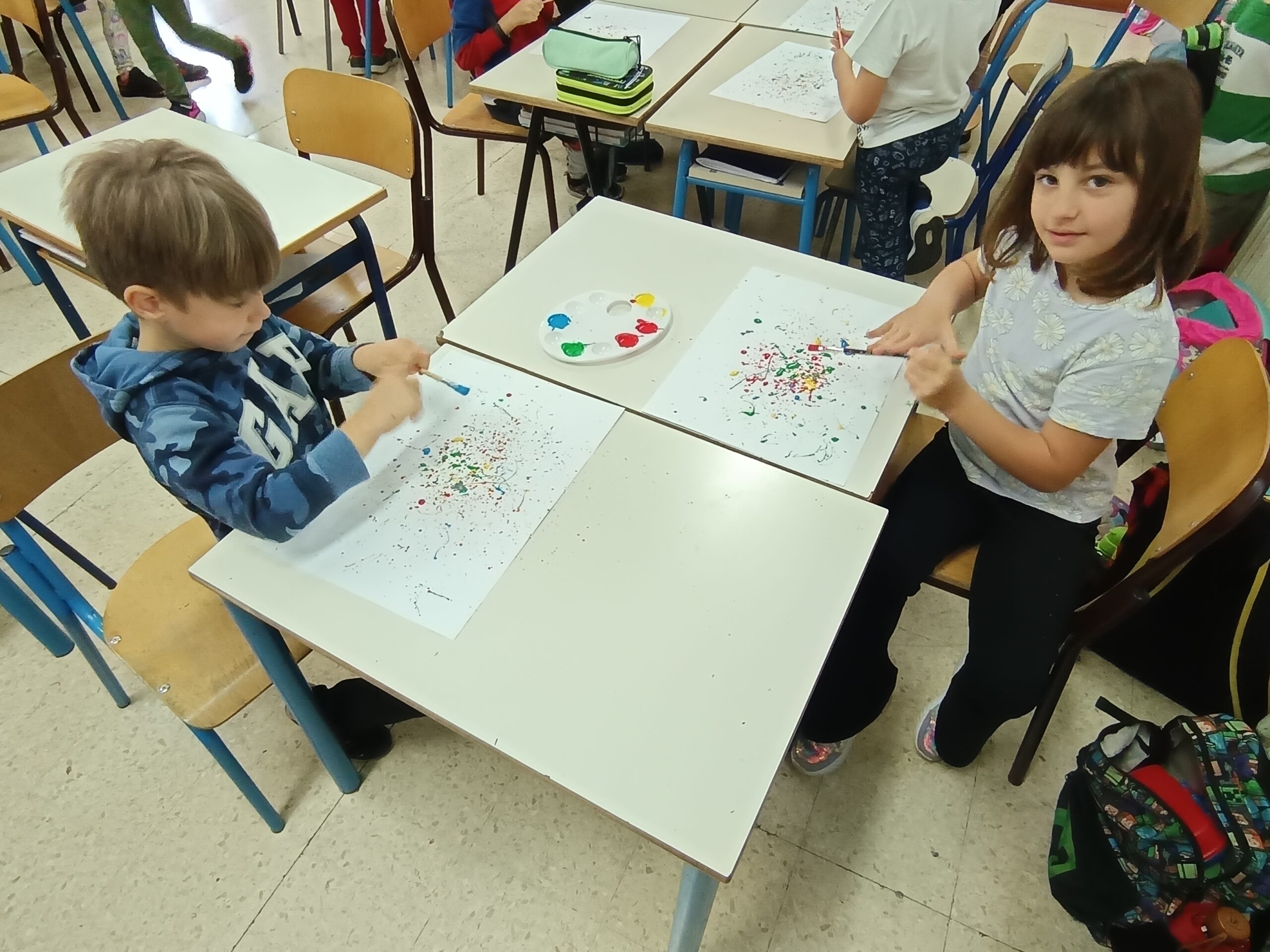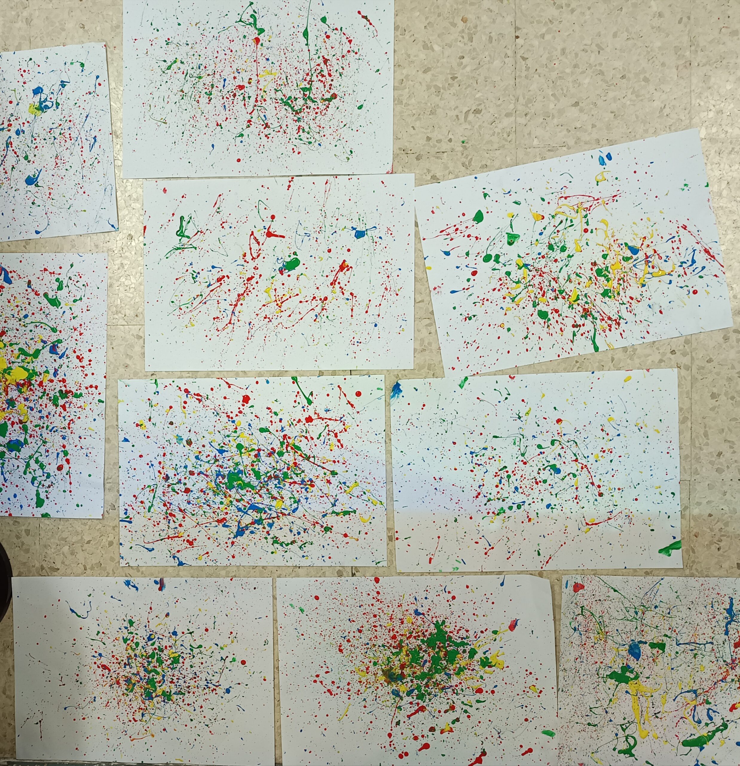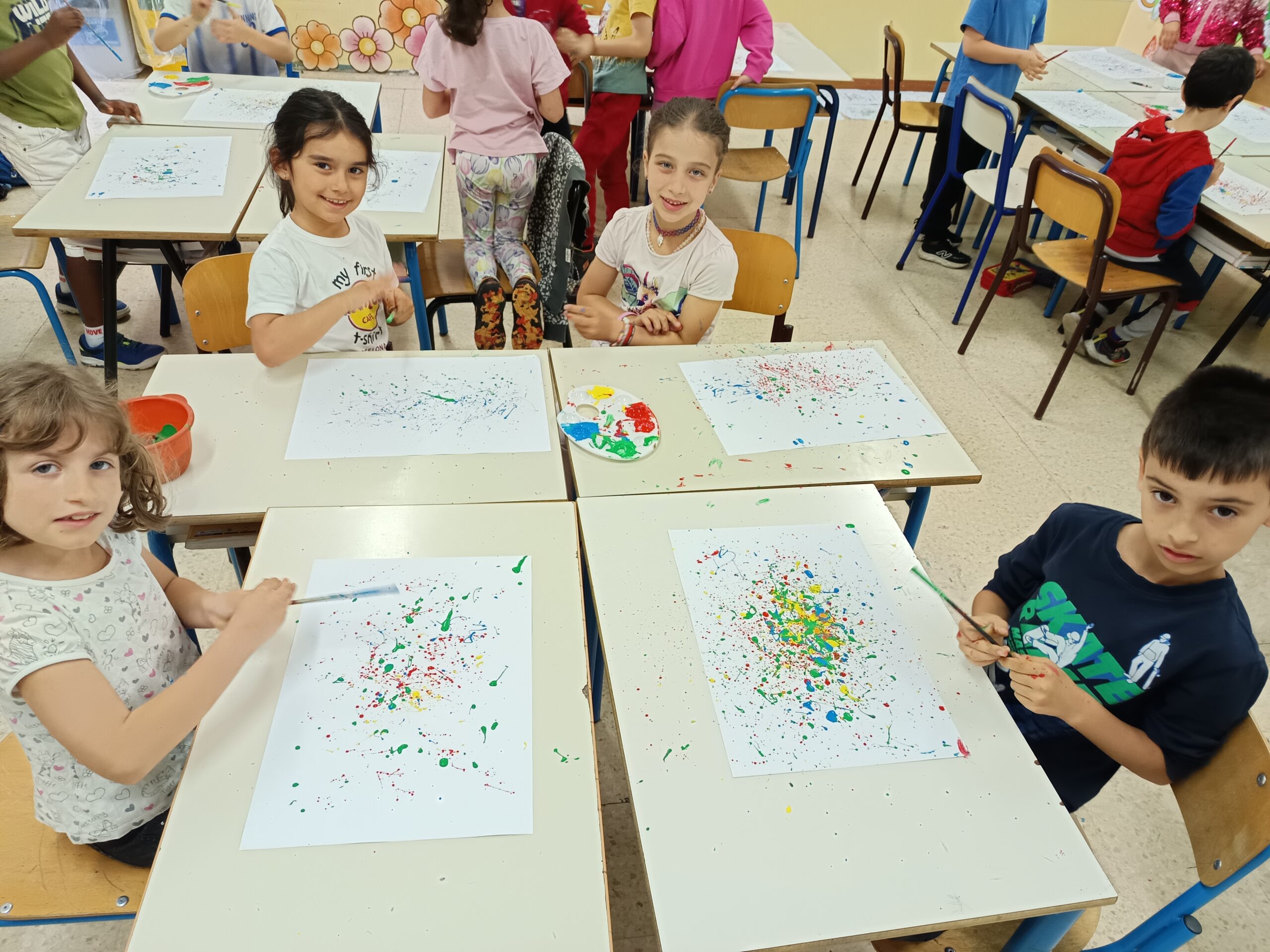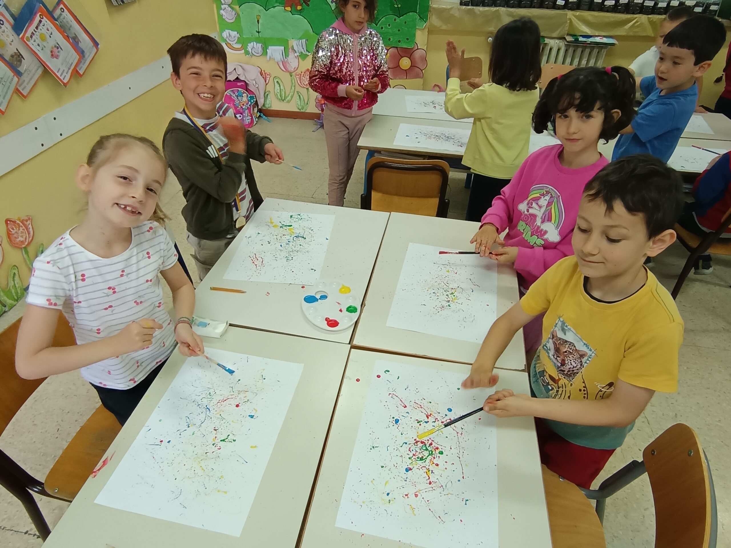 Pollock dipingeva in modo diverso: usava dei colori che sgocciolava sulla tela, creando disegni belli e un po’ caotici. Anche noi abbiamo provato a fare la stessa cosa, prendendo dei colori e macchiando il foglio. Libertà, creatività e divertimento sono stati alla base dei nostri lavori.”