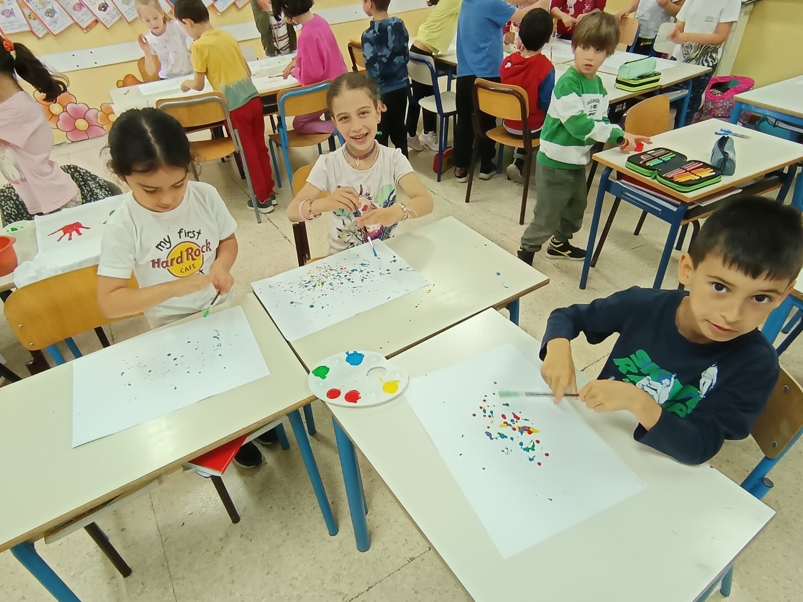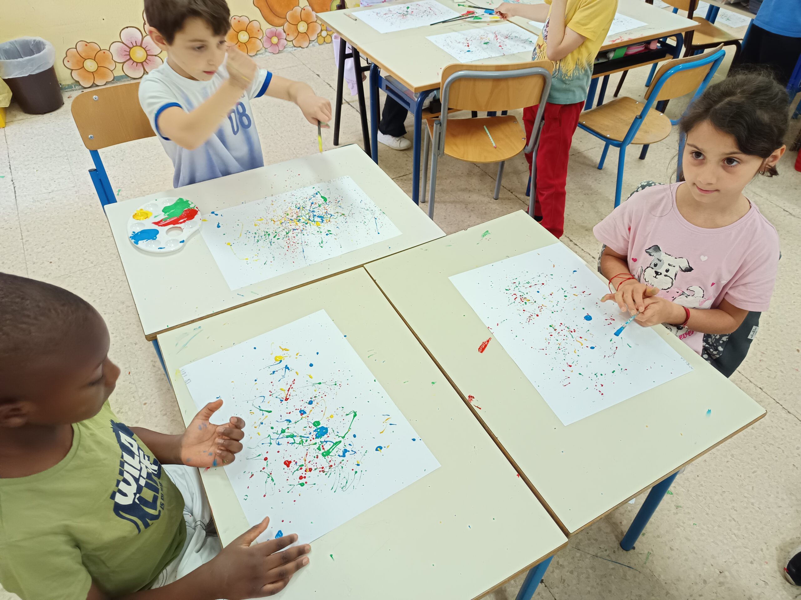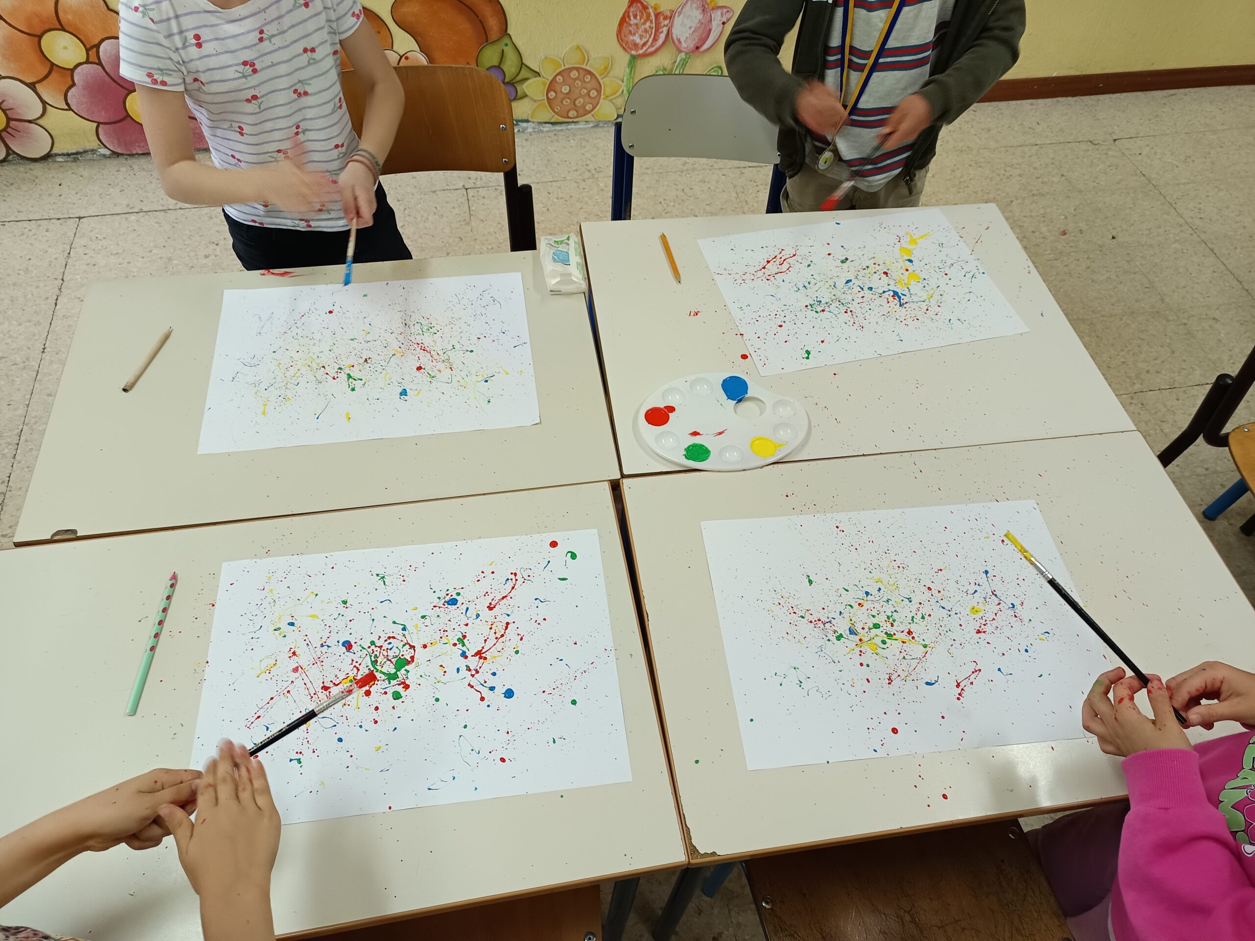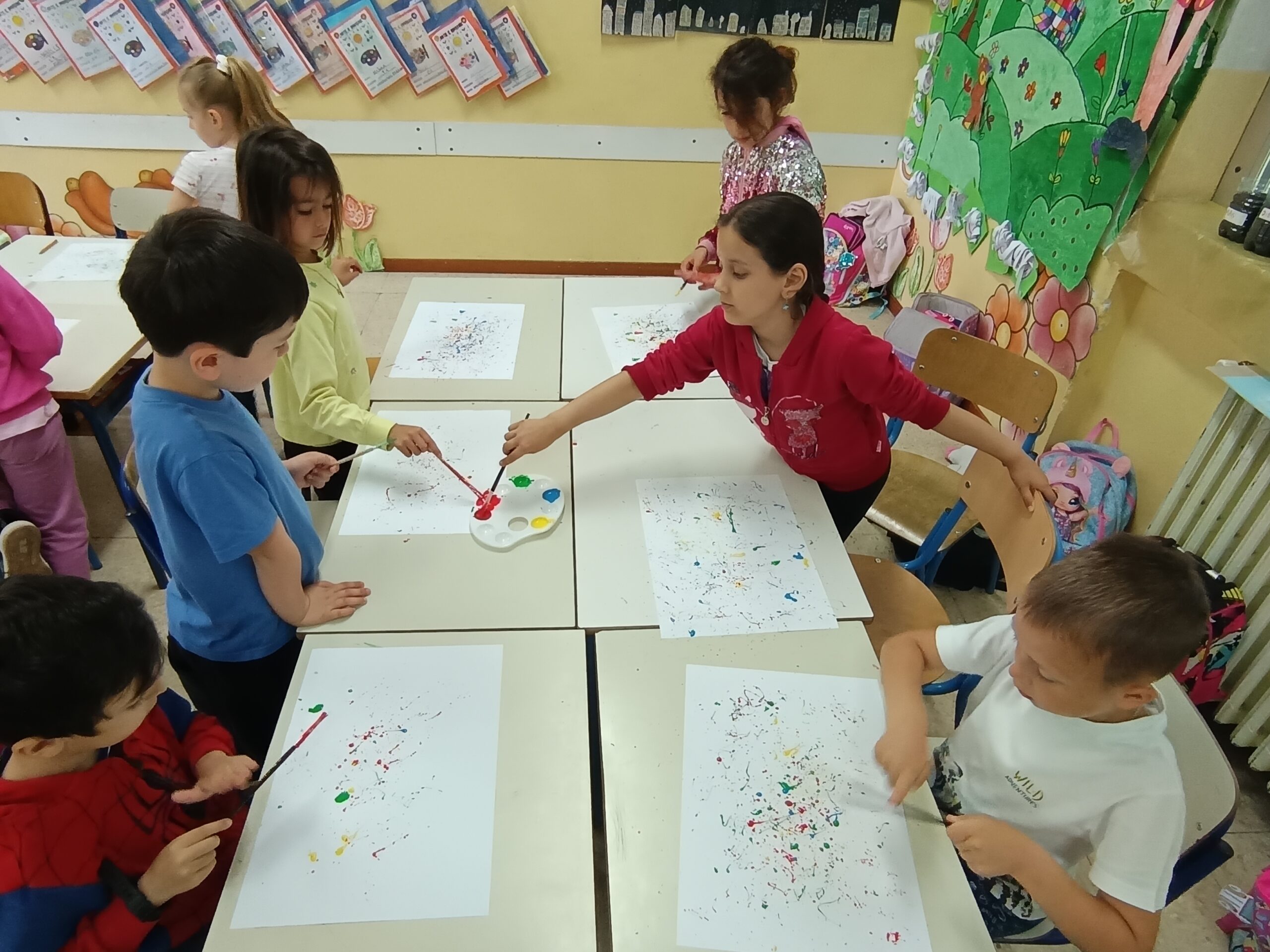 Pollock dipingeva in modo diverso: usava dei colori che sgocciolava sulla tela, creando disegni belli e un po’ caotici. Anche noi abbiamo provato a fare la stessa cosa, prendendo dei colori e macchiando il foglio. Libertà, creatività e divertimento sono stati alla base dei nostri lavori.”